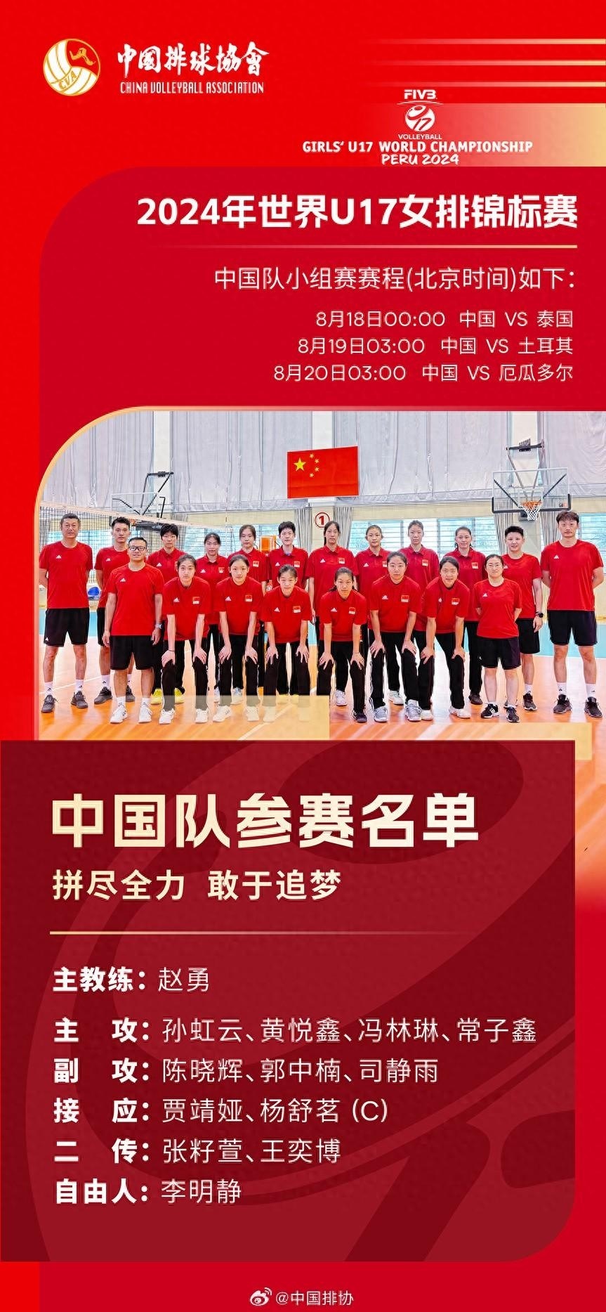 2024年世界U17女排锦标赛将于8月17日至24日在秘鲁利马举行。本届比赛共16支队伍参赛,中国队与土耳其队、泰国队、厄瓜多尔队分在B组。