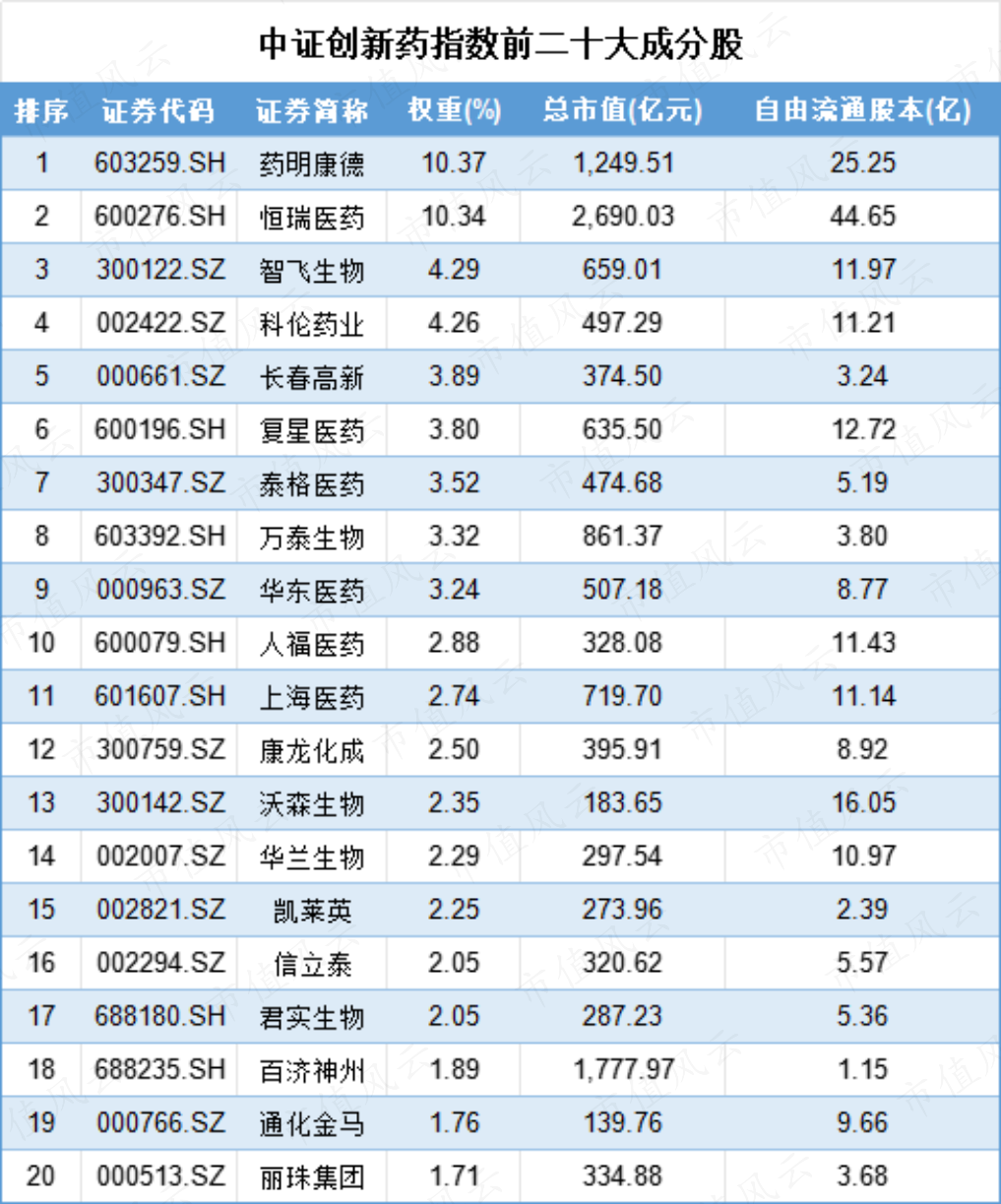 例如,该指数前两大成分股分别为药明康德(603259.SH)、恒瑞医药(600276.SH),权重均约为10.3%,智飞生物(300122.SZ)紧随其后,权重为4.2%。