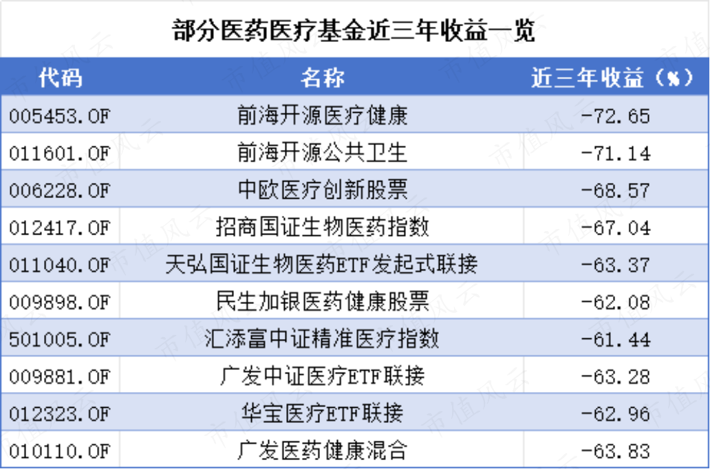 Choice数据显示,近三年亏损较大的10只医药医疗基金中,跌幅均超过了60%,跌得最狠的前海开源医疗健康(005453.OF)和前海开源公共卫生(011601.OF)更是跌了70%。