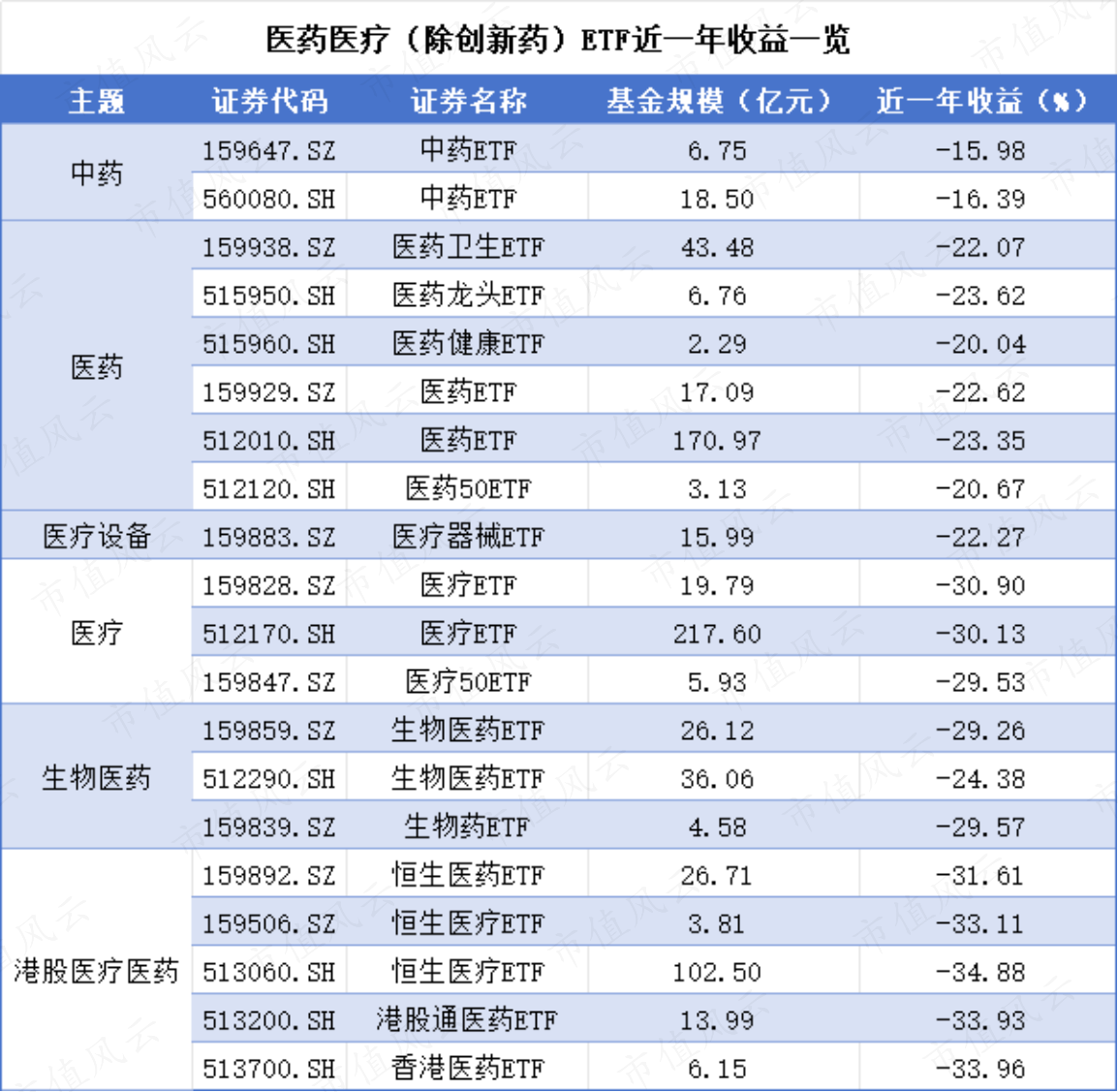 风云君整理了市面上规模2亿以上创新药相关ETF近一年收益情况,无论身处A股还是港股,无论跟踪什么样的指数,近一年的跌幅平均基本在20%以上。