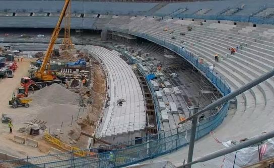近期,未来体育场第三层看台的骨架建设取得了重大进展。下层楼板已经完成混凝土浇筑,约70%的支柱和梁已经安装,从南门看台到北门几乎所有的支柱都已到位,正在等待安装模板,随后进行混凝土浇筑。为了加快施工进度,还安装了一系列脚手架,工人们可以更方便地工作,继续推进工程的巩固。