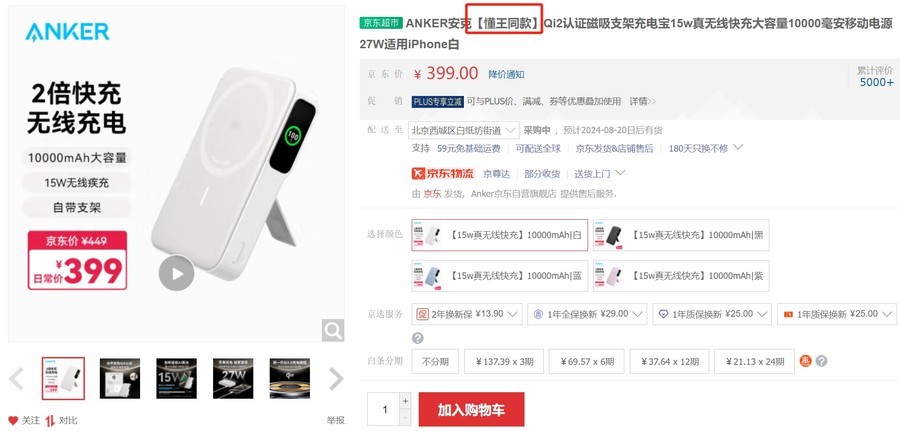 特朗普使用的这款产品为“ANKER安克Qi2认证磁吸支架充电宝”,目前在京东上的售价为399元,并且其官方店近日也使用了“懂王同款”的宣传术语,看来这次安克确实是蹭了个大的了~