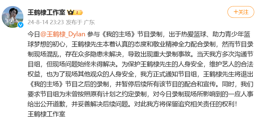 王鹤棣工作室发文:“今日王鹤棣参与《我的主场》节目录制,出于热爱篮球、助力青少年篮球梦想的初心,王鹤棣先生本着认真的态度和敬业精神全力配合录制,然而节目录制现场混乱,存在众多隐患未解决,导致出现重大录制事故。当天我方多次沟通节目组,但现场问题始终未得解决。为保护王鹤棣先生的人身安全,维护艺人的合法权益,也为了现场其他观众的人身安全,我方正式通知节目组,王鹤棣先生将退出《我的主场》节目之后的录制,并暂停后续所有该节目的配合和宣传。同时,我们要求节目组为未曾按照原有计划之约定录制,对今日录制现场所影响到的一应人事给出公开道歉,并妥善解决后续问题。对此我方将保留追究相关责任的权利!“
