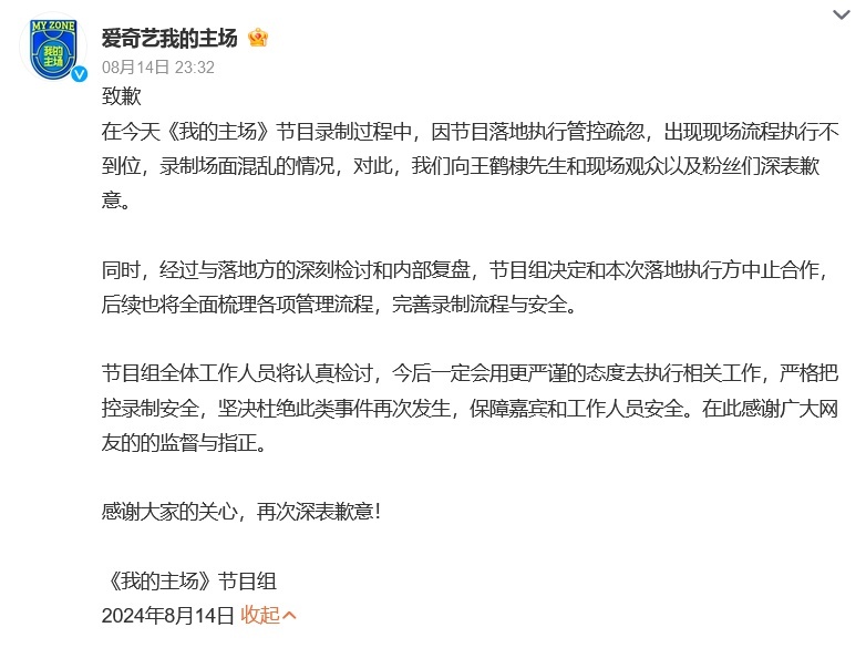 随后,《我的主场》节目组官博发文道歉:“在今天《我的主场》节目录制过程中,因节目落地执行管控疏忽,出现现场流程执行不到位,录制场面混乱的情况,对此,我们向王鹤棣先生和现场观众以及粉丝们深表歉意。同时,经过与落地方的深刻检讨和内部复盘,节目组决定和本次落地执行方中止合作,后续也将全面梳理各项管理流程,完善录制流程与安全。节目组全体工作人员将认真检讨,今后一定会用更严谨的态度去执行相关工作,严格把控录制安全,坚决杜绝此类事件再次发生,保障嘉宾和工作人员安全。在此感谢广大网友的的监督与指正。感谢大家的关心,再次深表歉意!”