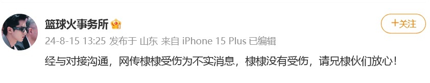 王鹤棣对接方发文否认受伤:“经与对接沟通,网传棣棣受伤为不实消息,棣棣没有受伤,请兄棣伙们放心! ”