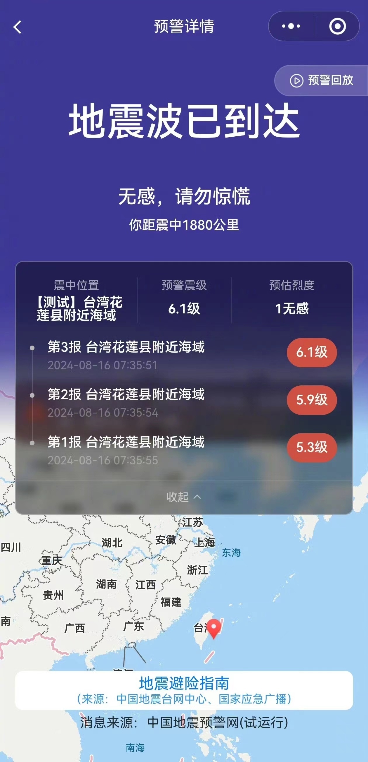 地震造成台湾震感强烈,福建、广东沿海地区有明显震感。中国地震预警网发布了本次地震的预警信息,福建网友通过微信小程序实时接收到了预警通知。