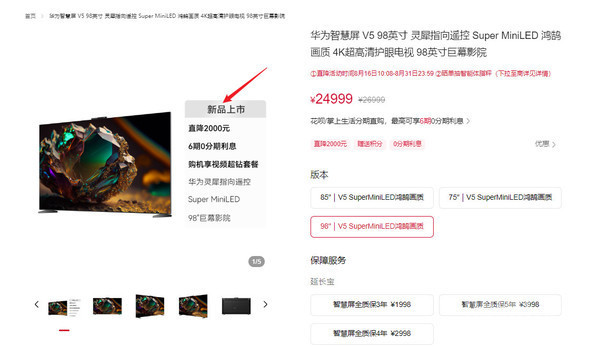 8月16日,CNMO科技了解到,华为智慧屏V5推出了98英寸新版本,售价26999元,现在活动直降2000元,到手24999元。除了98英寸版,华为智慧屏V5还提供了75、85英寸两种版本。