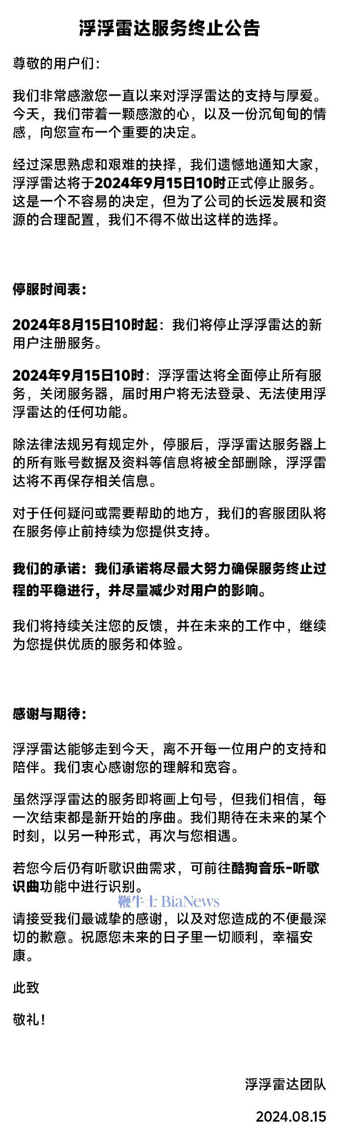 鞭牛士 8月16日消息,酷狗音乐旗下音乐识别 App“浮浮雷达”昨日宣布将于2024年9月15日10时正式停止服务,停服后,浮浮雷达服务器上的所有账号数据及资料等信息将被全部删除,浮浮雷达将不再保存相关信息。