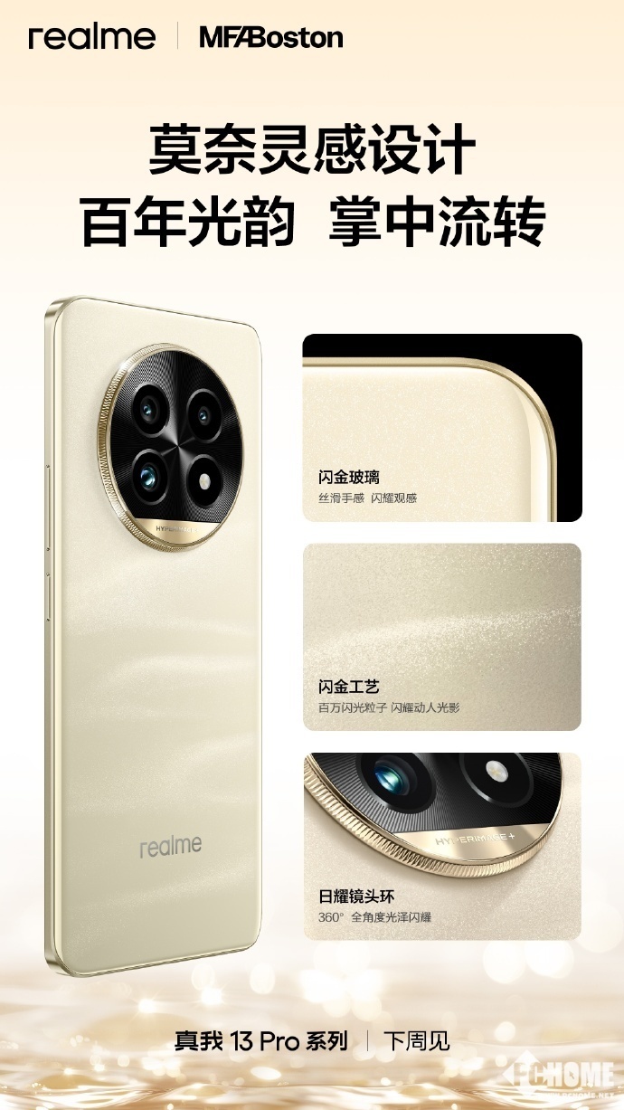 8月16日,真我官微曝光了真我13 Pro系列莫奈灵感的设计细节,采用闪金玻璃,丝滑手感,闪耀观感;拥有日耀镜头环,360°全角度光泽闪耀;加入闪金工艺,百万闪光粒子,闪耀动人光影。
