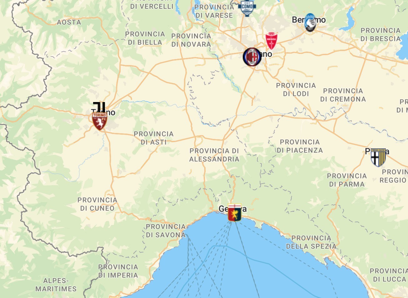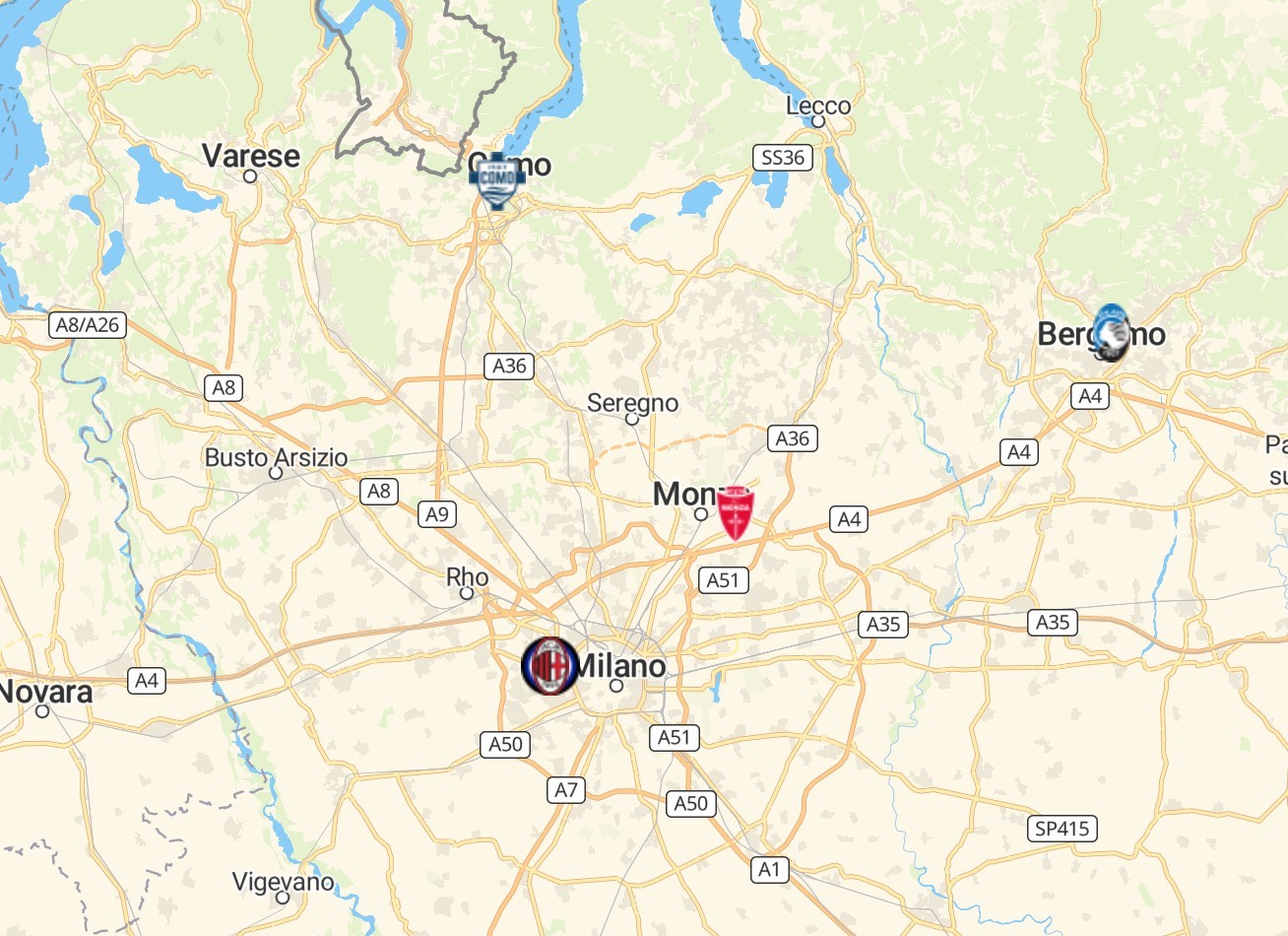 伦巴第大区北部的科莫湖,西南端有升班马球队科莫,他们也是新赛季意甲纬度最高的球队。伦巴第大区中部的贝加莫,坐落着意甲球队亚特兰大。在米兰城的东北部,还有一支球队蒙扎。
