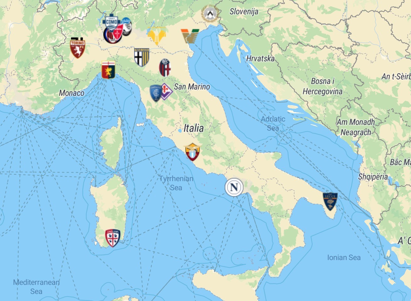 亚平宁半岛形似一个靴子,靴跟位置上的普利亚大区,其首府是巴里,新赛季巴里队征战意乙,征战意甲的球队是莱切,位于普利亚大区的东南侧。莱切东侧是亚得里亚海,靠近奥特朗托海峡,遥望东部巴尔干半岛的阿尔巴尼亚。