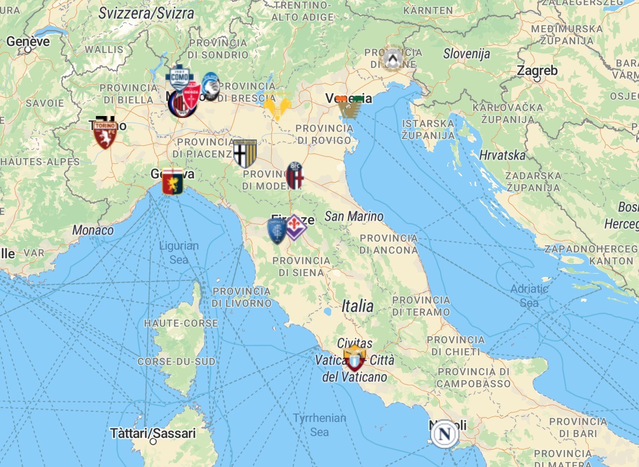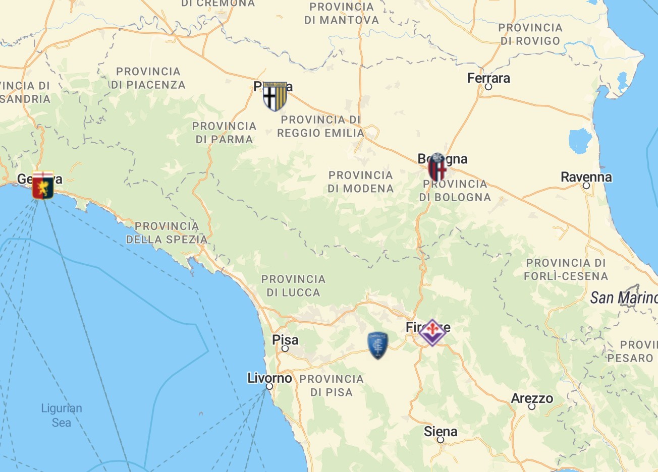 再往南,与科西嘉岛相望的是托斯卡纳大区,其首府是佛罗伦萨,欧洲文艺复兴的发源地。佛罗伦萨西部还有一支球队,正是恩波利队。