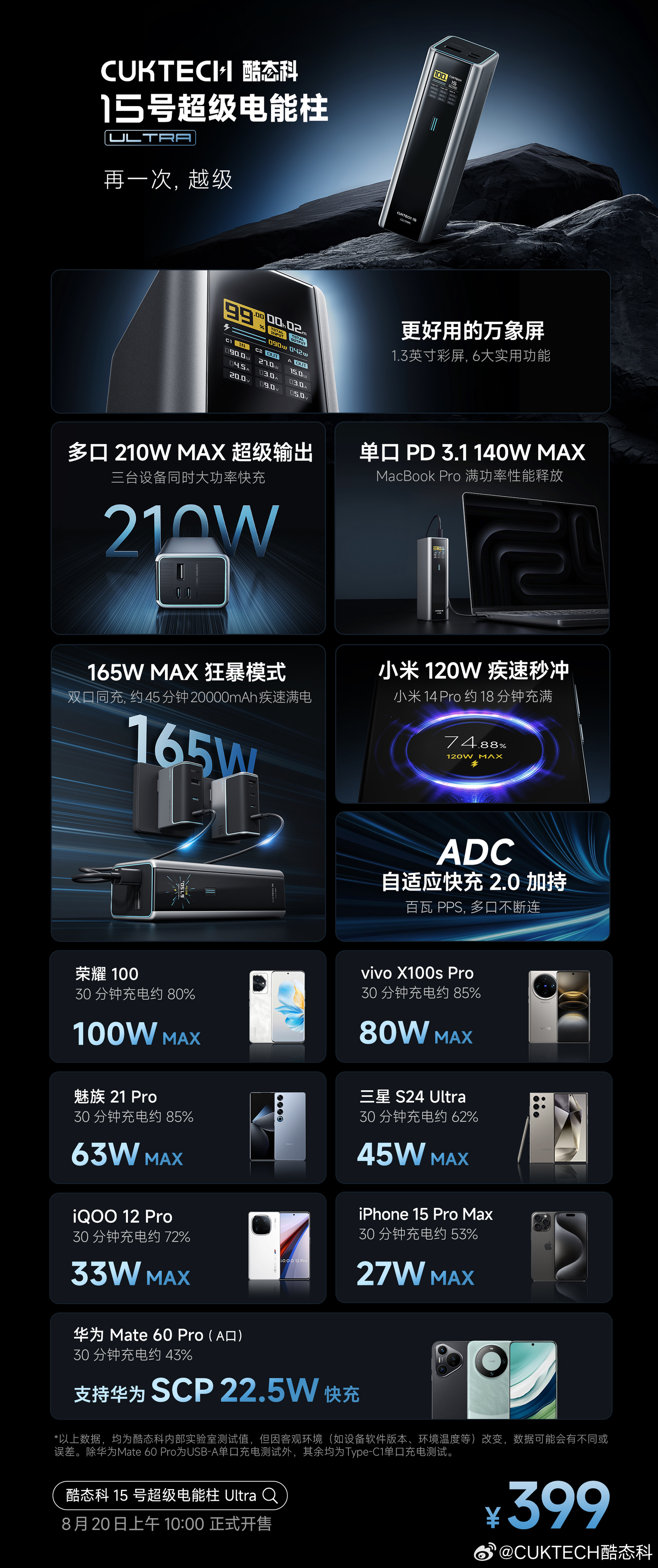 酷态科 15 号超级电能柱 Ultra 的定价为 399 元,将在 8 月 20 日正式开售。