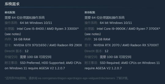 依据官方说明,最低配置得有 Intel Core i5-8400 或是 AMD Ryzen 3 3300X 处理器、16GB 内存以及 NVIDIA GTX 970/1650 或 AMD Radeon R9 290X 显卡。同时,游戏还需 100GB 的可用磁盘空间。要注意的是,在 Windows 11 上的 AMD CPU 需要 AGESA V2 1.2.0.7。另外,虽说游戏支持 HDD,但 BioWare 提议使用 SSD。