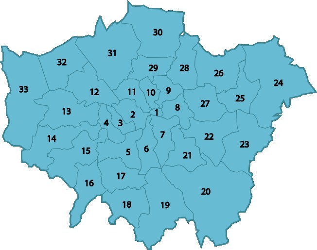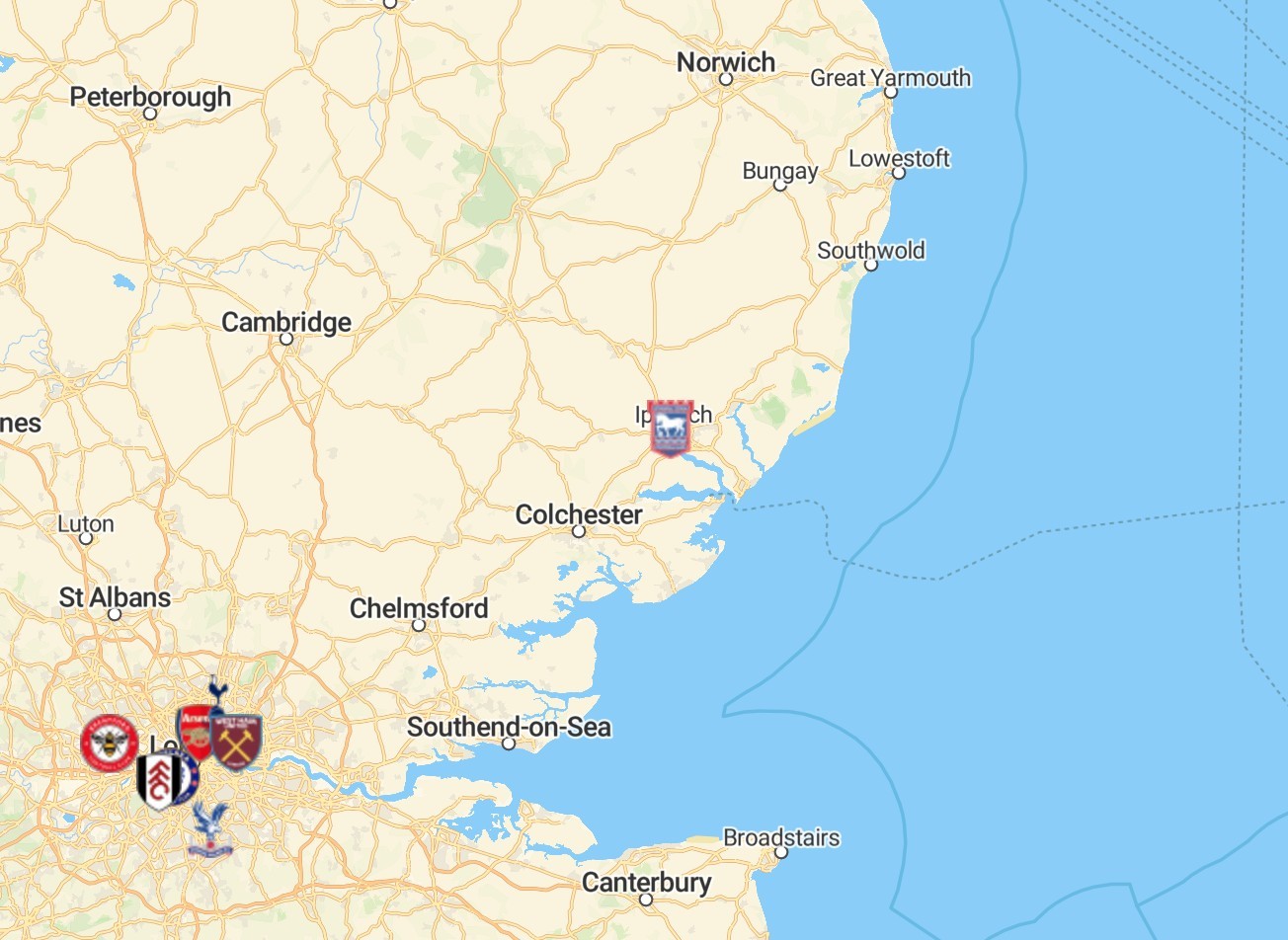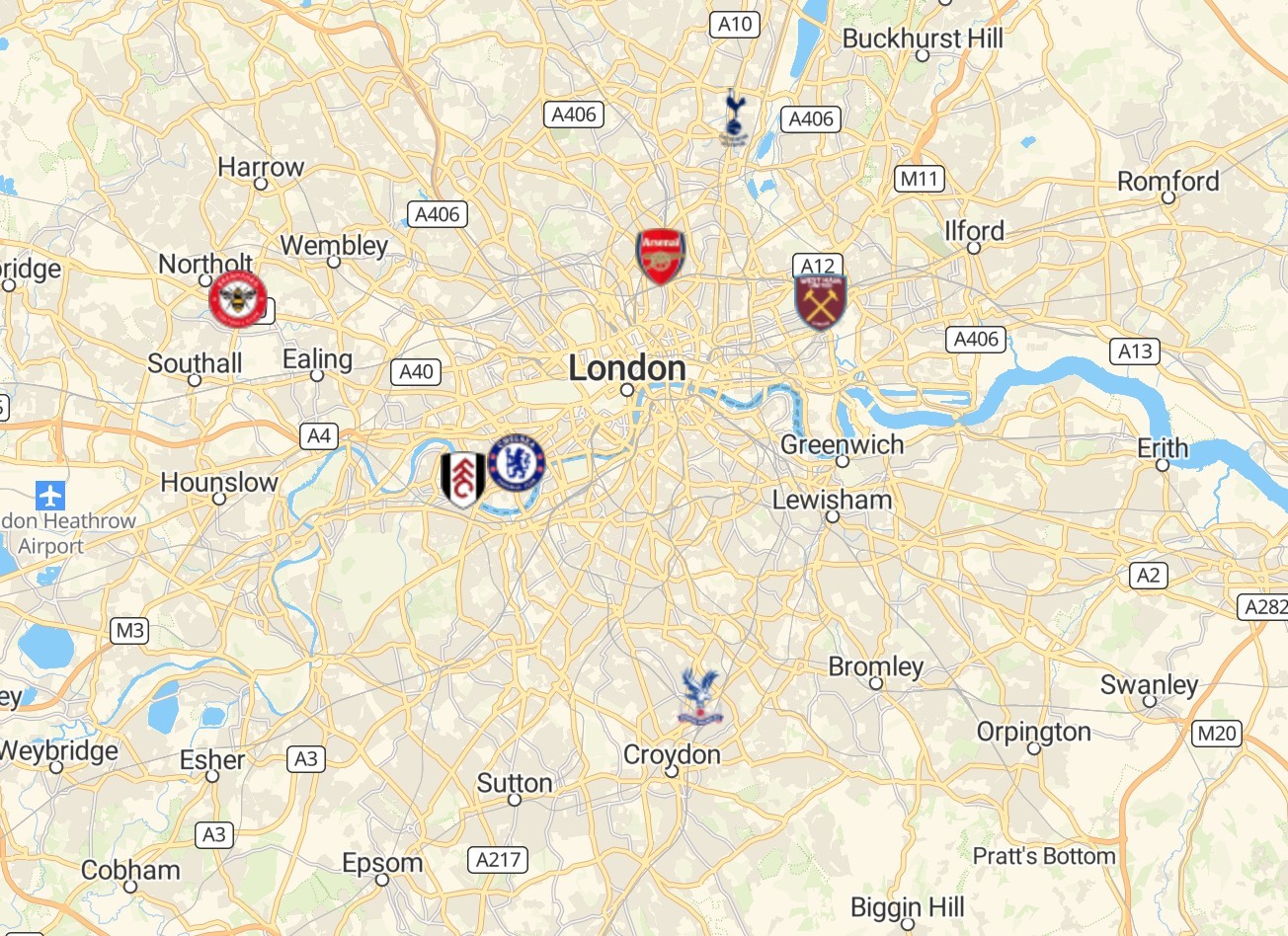 北伦敦有阿森纳与热刺,阿森纳位于伊斯灵顿区(图10),热刺位于哈林盖区(图29);西伦敦有切尔西与富勒姆,都位于哈默史密斯-富勒姆区(图4),外伦敦西部有布伦特福德,位于豪恩斯洛区(图14);东伦敦有西汉姆联,位于纽汉姆区(图27);外伦敦南部有水晶宫,位于克罗伊登区(图19)。