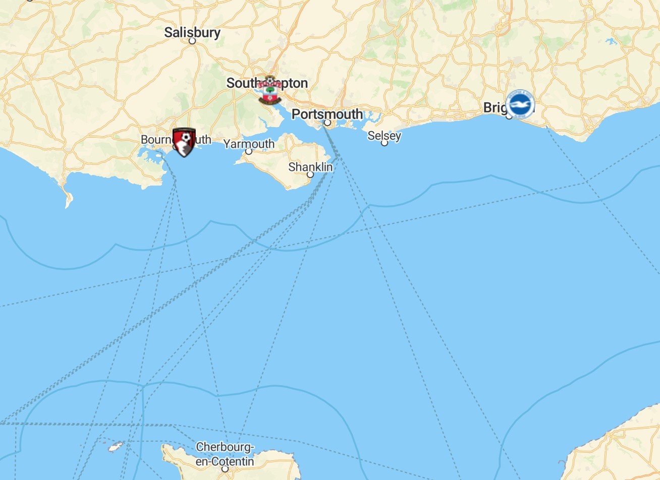 英格兰最南端,英吉利海峡北部有三支英超球队:伯恩茅斯、南安普顿、布莱顿。其中“樱桃”伯恩茅斯位于多塞特郡;“圣徒”南安普顿位于汉普郡,他们与朴茨茅斯的比赛被称为南海岸德比或汉普郡德比;“海鸥”布莱顿位于东萨塞克斯郡。