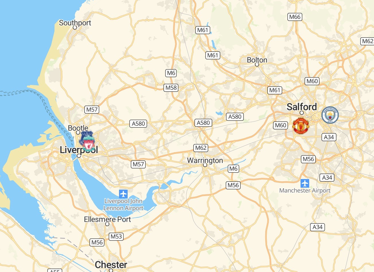 在英格兰的西北部,则有享誉英伦的两组著名德比对手:默西塞德郡德比、曼市德比。利物浦市是默西塞德郡最大的定居点,有“红军”利物浦和“太妃糖”埃弗顿两支死敌球队。默西塞德郡东部紧邻大曼彻斯特郡,其最大的定居点曼彻斯特市有“红魔”曼联和“蓝月亮”曼城。