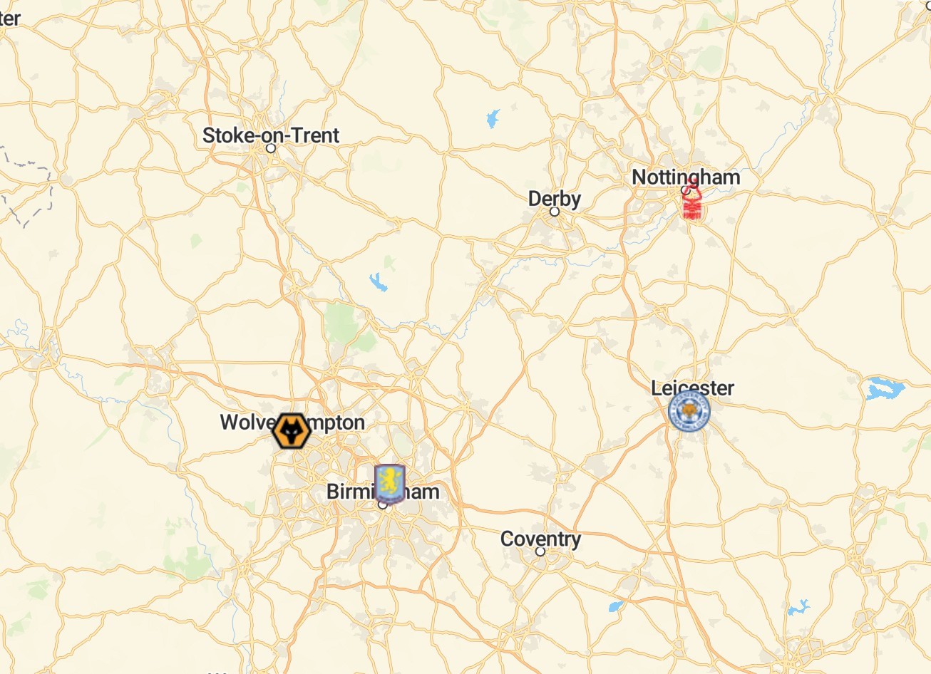 东米德兰兹郡是英格兰九个官方大区之一,英超联赛20支球队分布在其中八个大区: