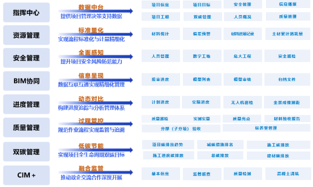数字化建造管控平台是项目运营管理的主要工具,融合BIM模型数据,通过一个指挥中心,推动项目七大业务板块精细化管理提效,构建了一个高度集成的智慧化管理体系。