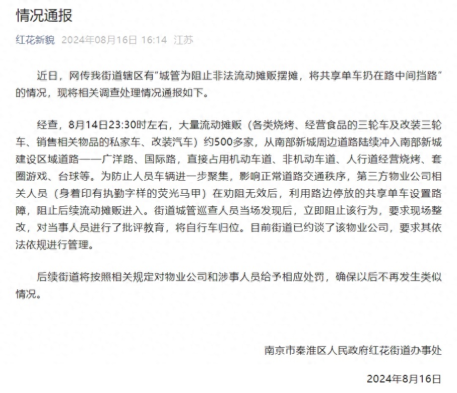8月16日,南京市秦淮区人民政府红花街道办事处发布情况通报称,近日,网传该街道辖区有“城管为阻止非法流动摊贩摆摊,将共享单车扔在路中间挡路”的情况,现将相关调查处理情况通报如下。