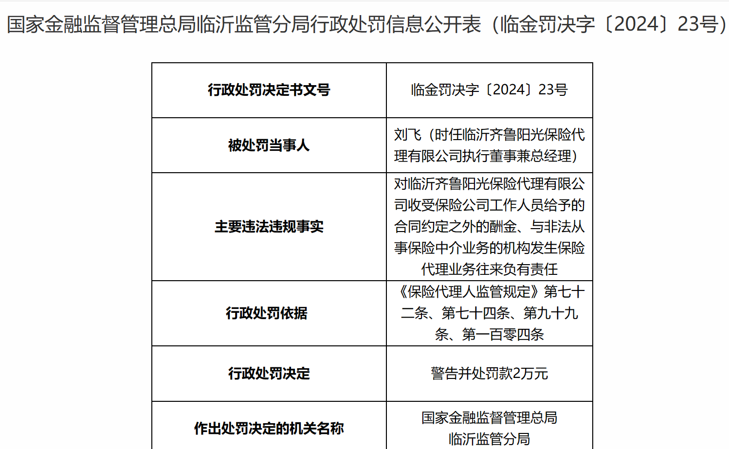 时任临沂齐鲁阳光保险代理有限公司执行董事兼总经理刘飞对临沂齐鲁阳光保险代理有限公司收受保险公司工作人员给予的合同约定之外的酬金、与非法从事保险中介业务的机构发生保险代理业务往来负有责任,被国家金融监督管理总局临沂监管分局警告并处罚款2万元。