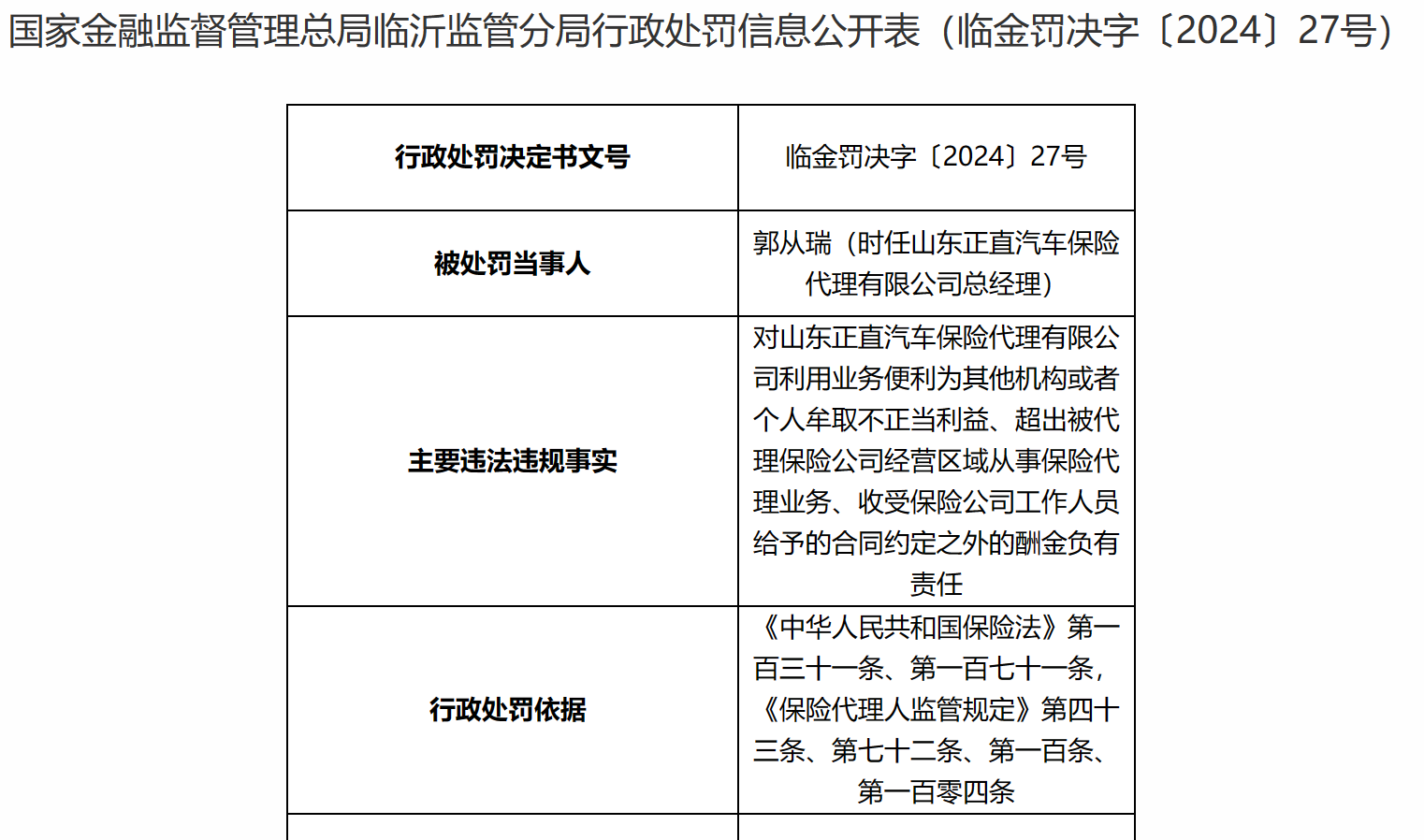 时任山东正直汽车保险代理有限公司总经理郭从瑞对山东正直汽车保险代理有限公司利用业务便利为其他机构或者个人牟取不正当利益、超出被代理保险公司经营区域从事保险代理业务、收受保险公司工作人员给予的合同约定之外的酬金负有责任,被警告并处罚款6万元。