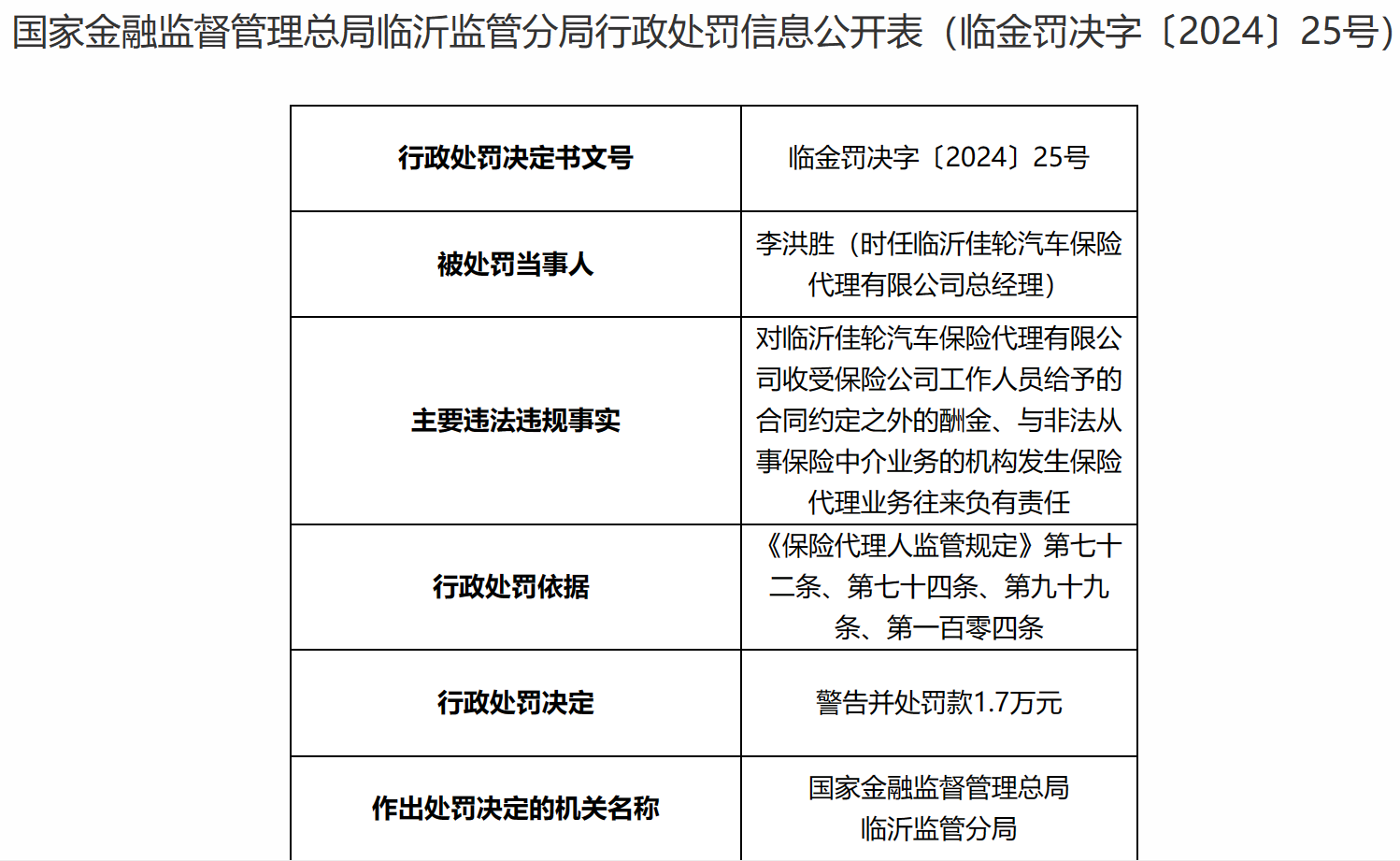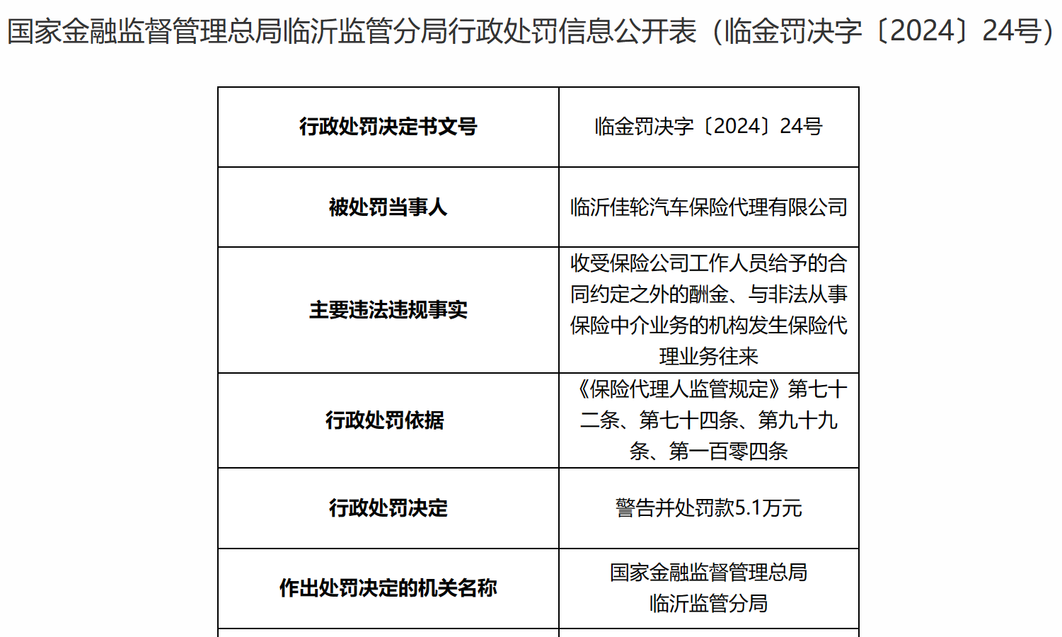 临金罚决字〔2024〕24号显示,临沂佳轮汽车保险代理有限公司因收受保险公司工作人员给予的合同约定之外的酬金、与非法从事保险中介业务的机构发生保险代理业务往来,根据《保险代理人监管规定》第七十二条、第七十四条、第九十九条、第一百零四条,被国家金融监督管理总局临沂监管分局警告并处罚款5.1万元。