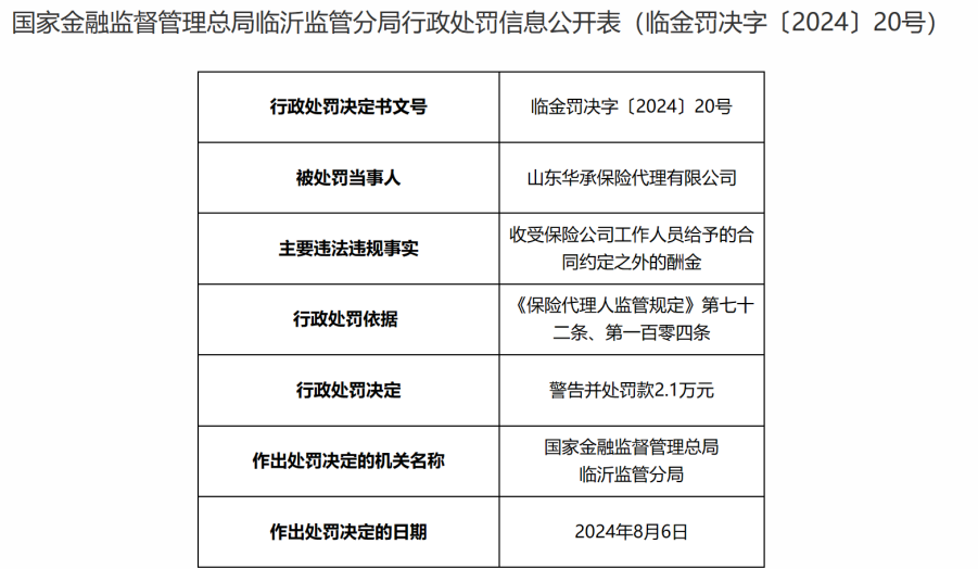 2024年8月6日,临金罚决字〔2024〕20号显示,山东华承保险代理有限公司因收受保险公司工作人员给予的合同约定之外的酬金,根据《保险代理人监管规定》第七十二条、第一百零四条,被警告并处罚款2.1万元,作出处罚决定的机关为国家金融监督管理总局临沂监管分局。