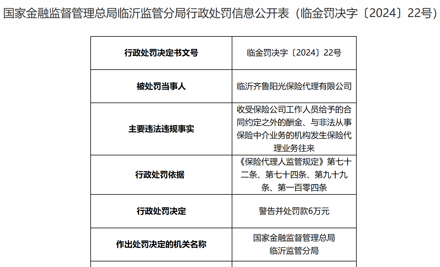 临沂齐鲁阳光保险代理有限公司因收受保险公司工作人员给予的合同约定之外的酬金、与非法从事保险中介业务的机构发生保险代理业务往来,根据《保险代理人监管规定》第七十二条、第七十四条、第九十九条、第一百零四条规定,被警告并处罚款6万元,行政处罚决定书文号为临金罚决字〔2024〕22号,作出处罚的机关为国家金融监督管理总局临沂监管分局,处罚时间为2024年8月6日。