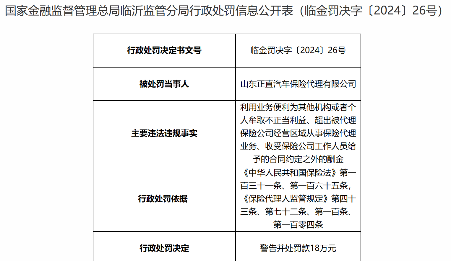 此外,山东正直汽车保险代理有限公司,利用业务便利为其他机构或者个人牟取不正当利益、超出被代理保险公司经营区域从事保险代理业务、收受保险公司工作人员给予的合同约定之外的酬金(临金罚决字〔2024〕26号),根据《中华人民共和国保险法》第一百三十一条、第一百六十五条,《保险代理人监管规定》第四十三条、第七十二条、第一百条、第一百零四条,被国家金融监督管理总局临沂监管分局警告并处罚款18万元。