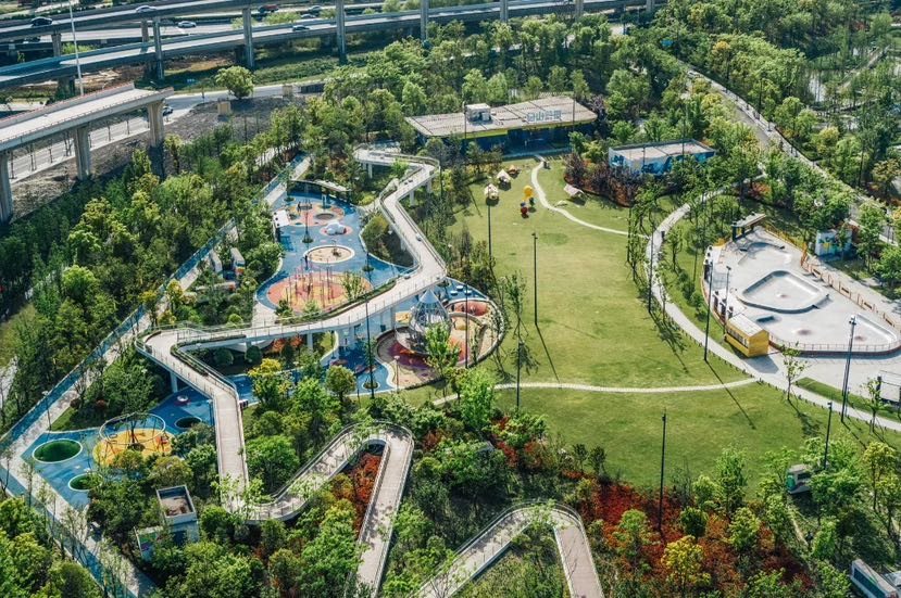 据了解,蟠龙天地街区以蟠龙天地中心区域的十字街作为主干道,设有6大主题功能区,3公里环形步道,近万方户外运动空间,满足人们对多功能户外空间的需求。街区与绿地之间还交错有长达3公里的水系,配上游船码头,尽显江南文化气质。