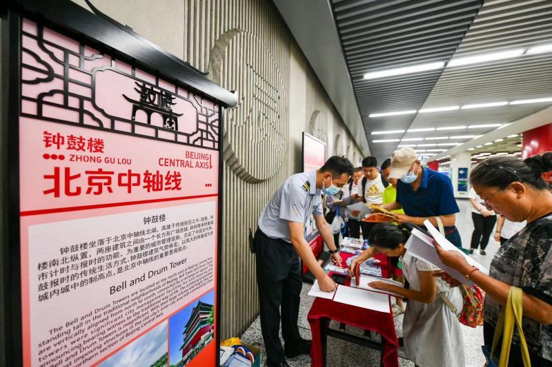 交通工具是流动的宣传载体。为进一步宣传展示“北京中轴线”文化,积极营造中轴文化展示氛围,8月16日全天,北京地铁公司在地铁8号线开展中轴文化遗产点特色印章打卡活动,并于当天在6座特色站点常态化设置中轴文化展板。