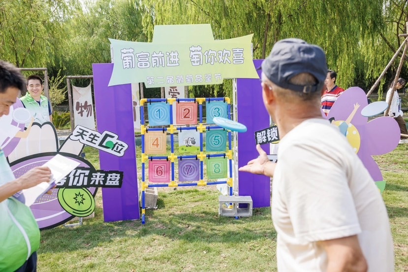 葡萄品鉴外,活动现场还专门设置了“萄”气集市、乡村游园会等体验区域。其中,“萄”气集市招募了镇、村特色农产品展销摊位,设置各类互动游戏,让参与者在品尝葡萄的同时了解当地农产品品牌,提高品牌知名度。乡村游园会则围绕葡萄主题,开展知识讲解、有奖问答以及互动游戏,让现场观众沉浸式了解葡萄相关小知识。