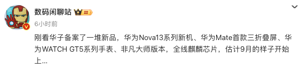 还有华为 WATCH GT5 系列手表、非凡大师版本等,预计都会在 9 月份跟咱们见面。