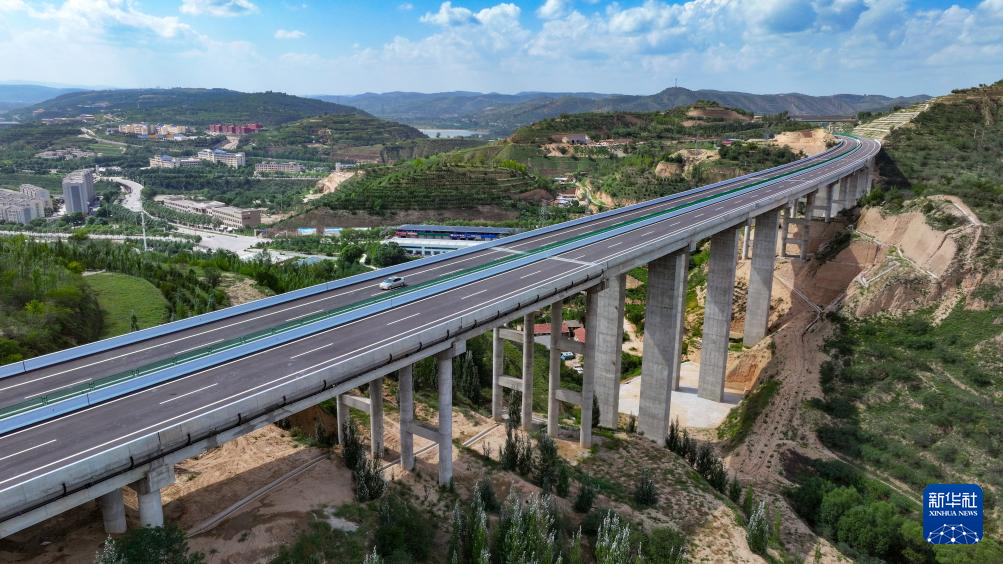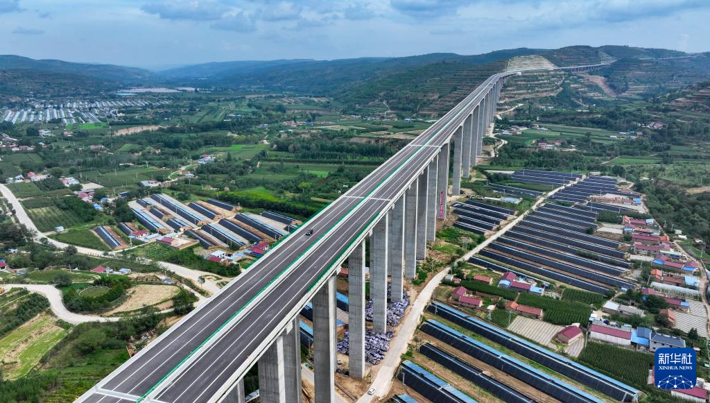 8月16日,车辆行驶在银昆高速杜家沟大桥上,远处是宁夏固原市彭阳县县城(无人机照片)。