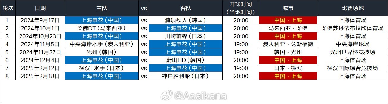 上海申花队亚冠精英联赛初排赛程(开球时间均为当地时间):