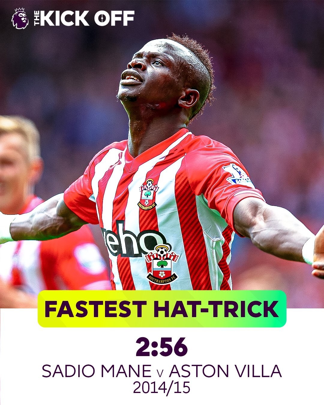 最快帽子戏法:2分56秒(马内2014-15赛季南安普顿vs阿斯顿维拉)