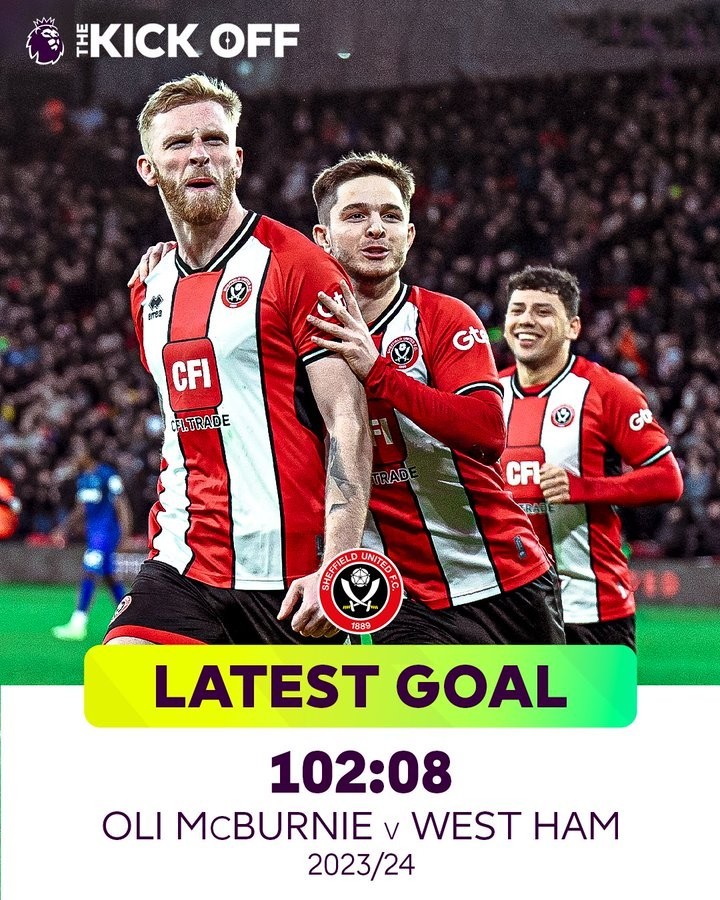 最迟进球:102分08秒(麦克布涅2023-24赛季谢菲尔德联vs西汉姆联)