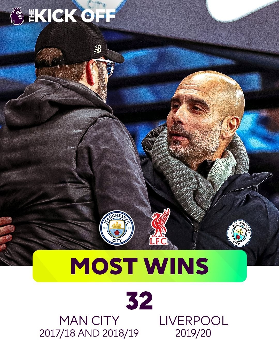 最多胜场:32场(曼城2017-18、2018-19赛季,利物浦2019-20赛季)