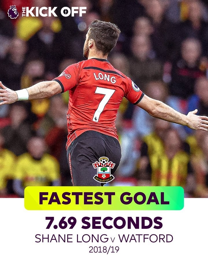 最快进球:7.69秒(肖恩-朗2018-19赛季南安普顿vs沃特福德)
