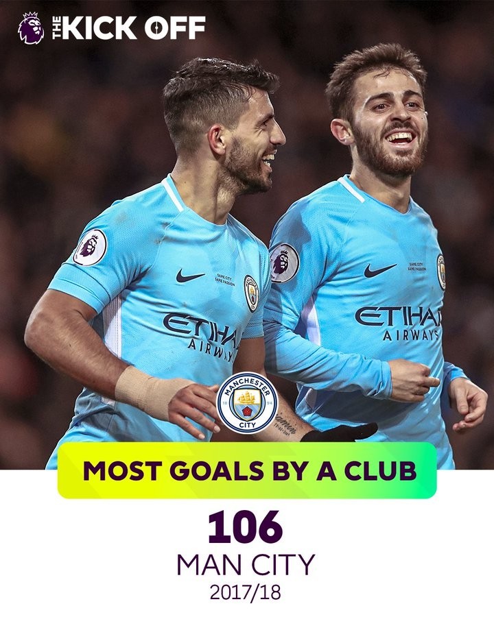 最多进球:106球(曼城2017-18赛季)
