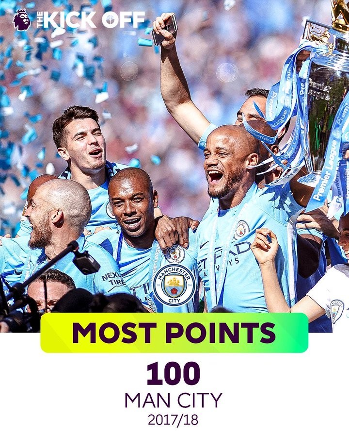 最高积分:100分(曼城2017-18赛季)