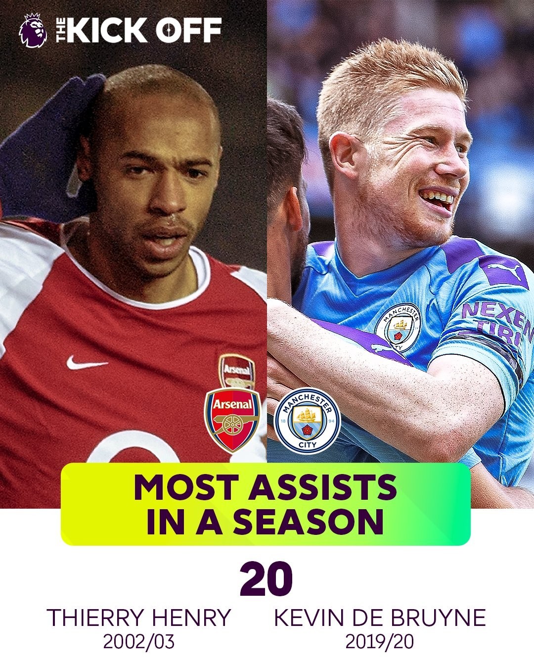 球员最多助攻:20次(亨利2002-03赛季,德布劳内2019-20赛季)