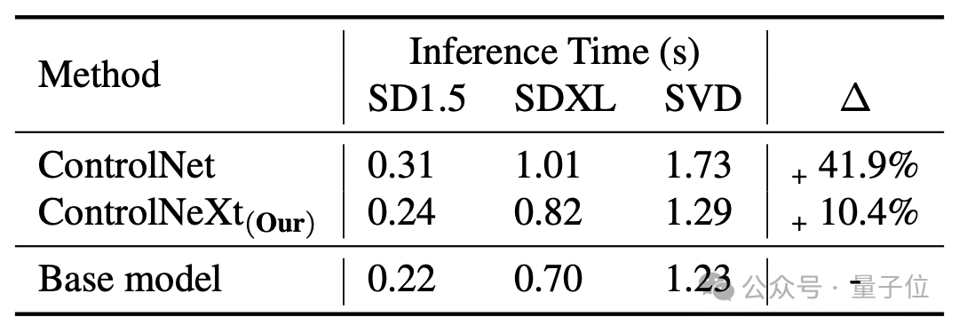 生成的速度也比ControlNet更快,平均下来ControlNet相当于基础模型会带来41.9%的延时,但ControlNeXt只有10.4%。