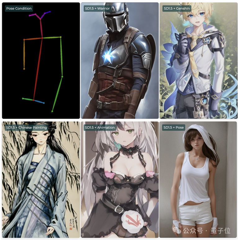 比如在SD1.5中,可以把姿势(Pose)控制条件与各种LoRA搭配使用,形成风格迥异乃至跨越次元,但动作相同的角色。
