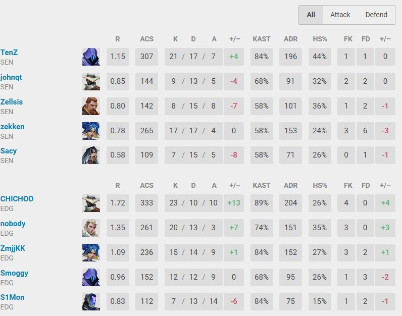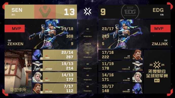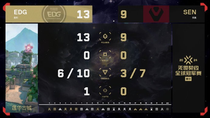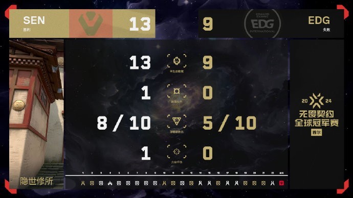 第17回合,SEN完成回防,6-11。第18回合,s1mon在A大打出首杀+双杀,EDG在最后的2打1残局中没能及时补枪,tenz个人能力爆发拿下三杀,6-12,SEN拿到6个局点。