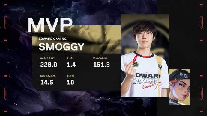 第3回合,EDG奖励局一波进B,s1mon直接双杀,1-2。第4回合,双方进入2打2残局,johnqt小身位晃+穿墙爆头打开局面,smoggy遗憾未能打出1v2串烧,1-3。第5回合,EDG进C下包直接穿墙打掉一人,后续守包失败,1-4。第6回合,EDG存钱局,1-5。