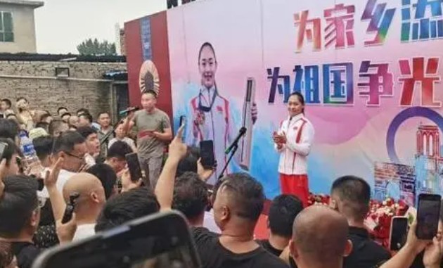 院内临时搭建的舞台上,身穿运动服、扎着长辫子的常园,正在欢迎她回家的仪式上致辞。身后背景板上,印有她8天前在巴黎奥运会拳击项目女子54公斤级决赛中夺金的照片。