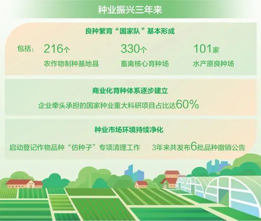 日前,记者从农业农村部了解到,3年来,种业振兴五大行动阶段性任务落实落地,一些基础性开创性长远性工作实现新突破,取得一批标志性成果,种业振兴迈出坚实步伐。