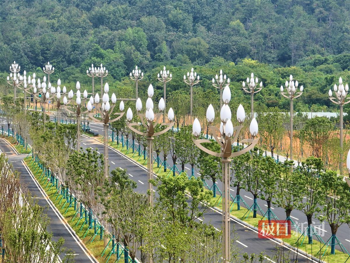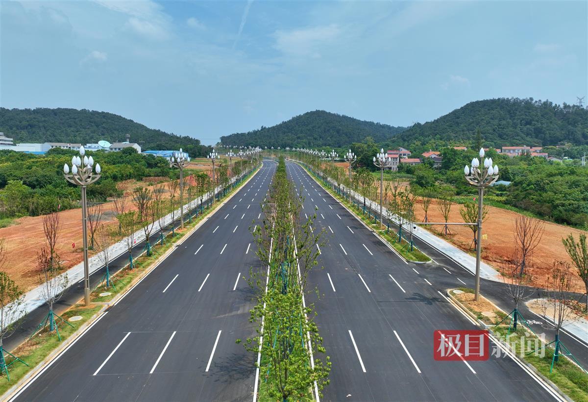 8月18日,俯瞰武汉市江夏区山湖大道,大道路面宽阔平整、标线分明,沿线路灯已安装到位。